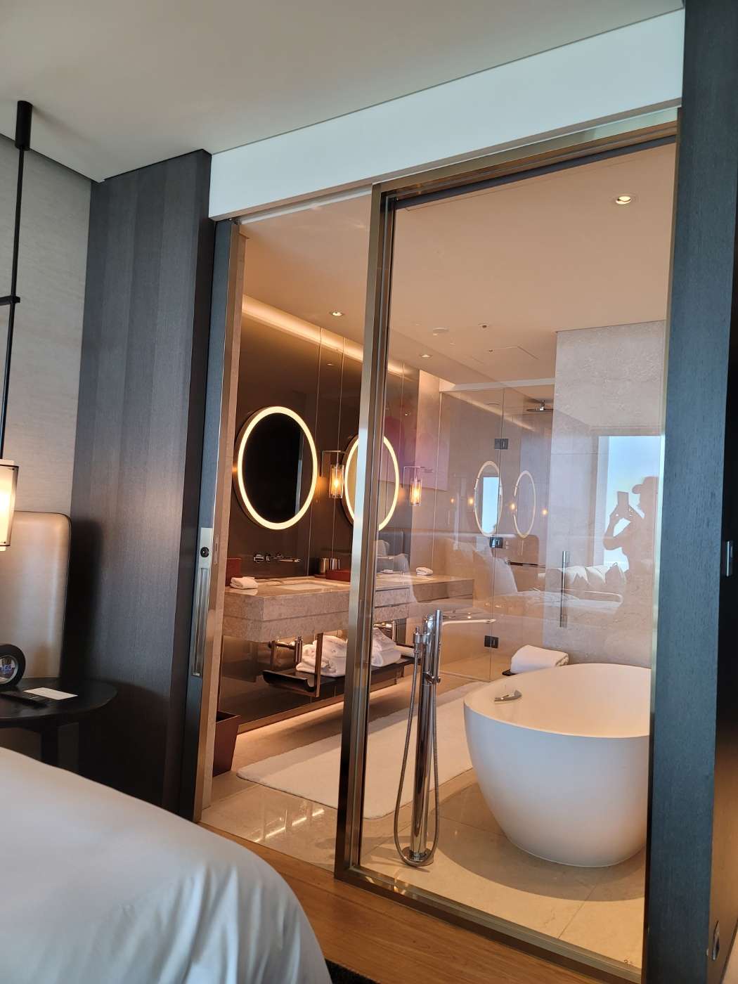 그랜드 하얏트 제주는 룸 전체가 스위트라 룸이 널찍하고 여유로운 것이 특징입니다. 소화와 리클라이너가 있어 침대에는 깨끗한 상태로만 올라가길 좋아하시는 분들- 사실 저 -도 편안하게 휴식을 취할 공간이 충분합니다. 침구는 시몬스 제품을 사용한다고 하는데요, 매우 푹신하고 깨끗해 여행 후 정말 편안하게 잘 수 있었습니다. 화장실도 매우 넓고 욕조가 잘 갖춰져 있는데, 투명 유리 부분은 버튼을 조정하여 불투명하게 블라인드를 칠 수 있습니다. 야외 조망을 보면서 반신욕을 즐기시려면 투명하게 해두고 하셔도 좋습니다. 욕조 곡선이 부드러워 기대 누워 쉬기 좋습니다. 미니바에는 컵라면, 과자, 탄산음료, 맥주 등이 있지만, 유료이며 가격표를 확인할 수 있습니다. 무료인 것은 캡슐커피, 생수, 티백 차입니다.