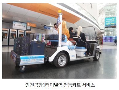 차를 가져와야 할 정도로 짐을 많이 가져왔다면, 보통 쓰는 수동 카트를 미는 것은 생각보다 많은 힘이 들어갈 수 있습니다. 제 1여객터미널 직통 열차 개찰구 근처에 대기 중인 전동 카트가 있다면 무료로 이용할 수 있습니다. 본래는 직통 열차에 제휴된 서비스이나, 이용 시 표 확인 등을 거치지 않기 때문에 원하는 사람은 무료로 이용할 수 있도록 되어 있습니다. 다만 그 자리에 전동 카트가 보이지 않는다면 현재 운행 중인 상황이니 조금 기다리셔야 합니다.