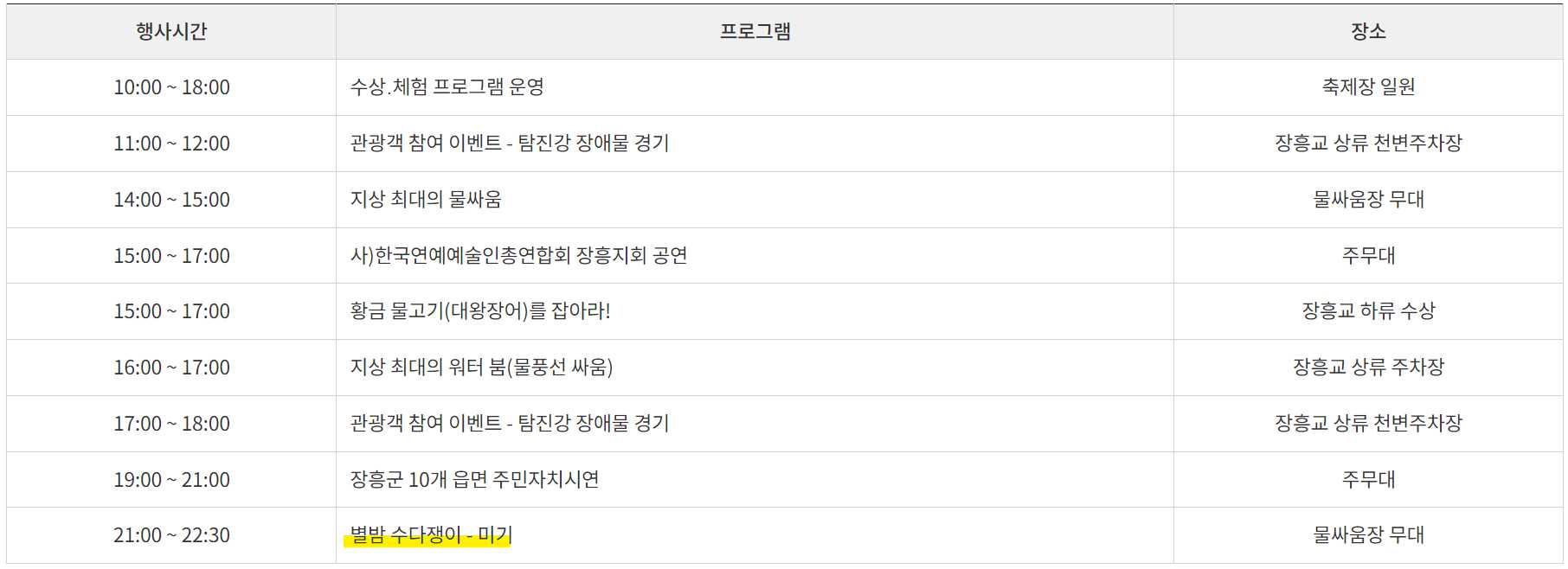 유난히 길던 장마가 끝나고 본격적인 휴가철이 시작되었습니다. 활발히 진행되고 있는 지역 축제 중 워터밤이나 가수 싸이의 흠뻑쇼를 연상케 하는 물총쇼 등의 물놀이를 가득 즐길 수 있는 지역 축제가 있어 소개해드립니다. 장흥 탐진강에서 진행되고 있는 <장흥물축제>인데요, 탐진강은 전국 댐 중에서 청정 1급의 최고 수질을 자랑하는 깨끗한 강으로 이곳에는 물박물관이 있을 정도로 물에 대한 자부심이 있는 고장입니다.