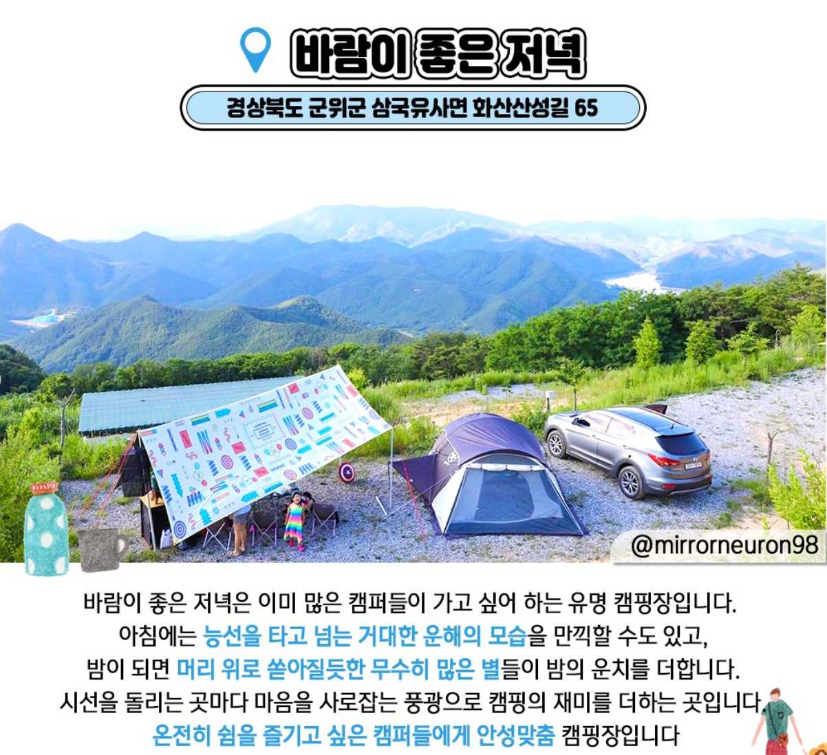 - 바람이 좋은 저녁 / 경상북도 군위군 삼국유사면 화산산성길 65 : 유명한 캠핑장. 아침에는 능선을 타고 넘는 거대한 운해의 모습을 볼 수 있고, 밤에는 별을 관측하기 좋습니다. 풍광이 좋아 캠퍼들에게 인기가 많습니다.