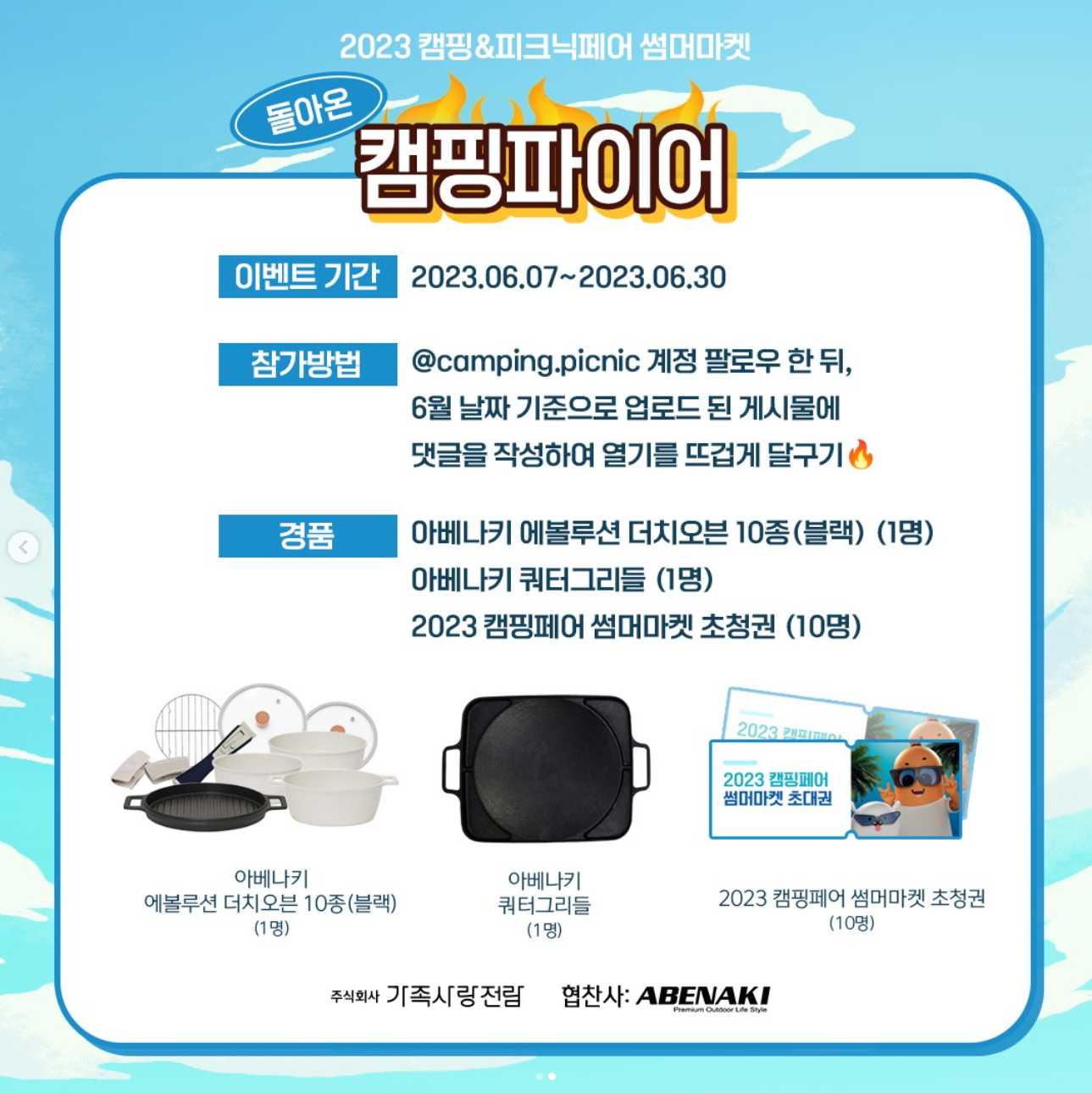 2023년 6월 30일까지 캠핑&피크닉페어 썸머마켓 인스타그램 공식계정을 팔로우하고 이벤트 페이지에 댓글을 달면 추첨하여 경품을 주는 이벤트를 진행하고 있습니다. 아베니카 에볼루션 더치오픈 10종(블랙) 1명, 아베니카 쿼터그리들 1명, 2023 캠핑페어 썸머마켓 무료초청권 10명에게 준다고 합니다.