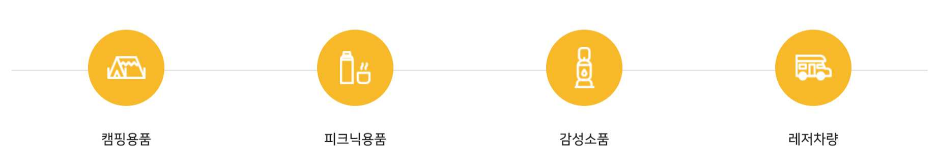 - 캠핑용품 : 텐트, 타프, 캠핑 퍼니처, 취침용품, 취사도구, 조명기구, 디지털기기, 위생용품, 안전장비 등