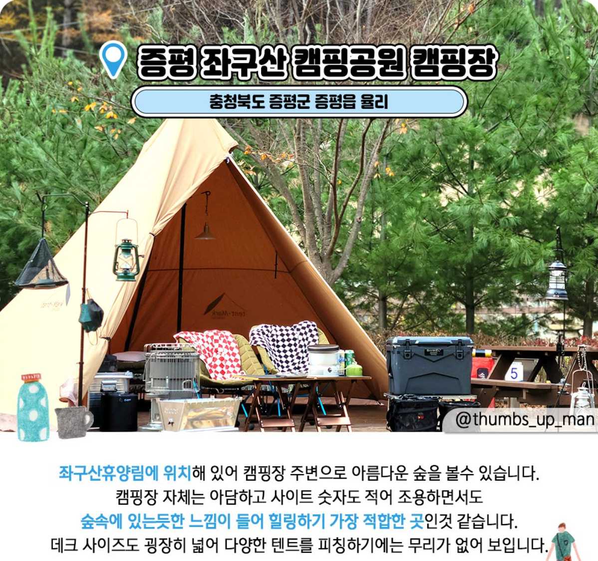 - 증평 좌구산 캠핑공원 캠핑장 / 충청북도 증평군 증평읍 율리 : 좌구산 휴양림에 위치한 캠핑장으로 주변 풍경이 아름답습니다. 캠핑장 자체는 아담하고 작으나 조용하고 숲 속에 있는 듯한 느낌을 주는 곳으로 힐링하기 좋습니다. 데크 사이즈도 넓어 다양한 텐트를 피칭하기 좋습니다.