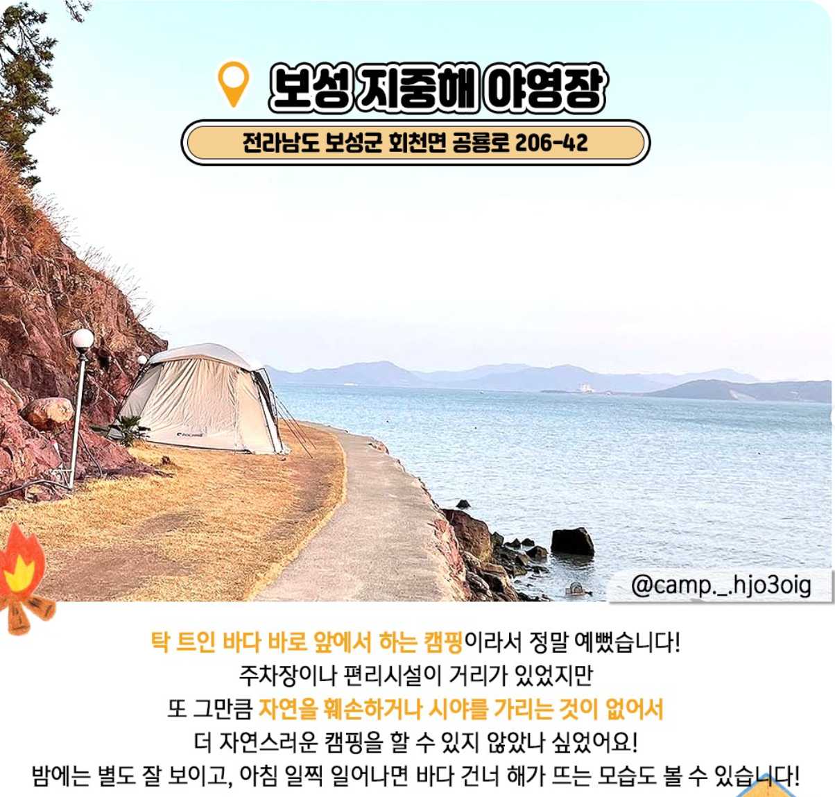 - 보성 지중해 야영장 / 전라남도 보성군 화천면 공룡로 206-42 : 탁 트인 바다 바로 앞에 자리 잡은 캠핑장으로, 주차장이나 편리시설과는 거리가 있으나 그만큼 자연을 훼손하거나 시야를 가리는 것이 없어 더 자연스러운 캠핑을 할 수 있는 곳입니다. 밤에 별도 잘 보이고, 아침 일찍 일어나면 바다 너무 일출을 볼 수 있습니다.