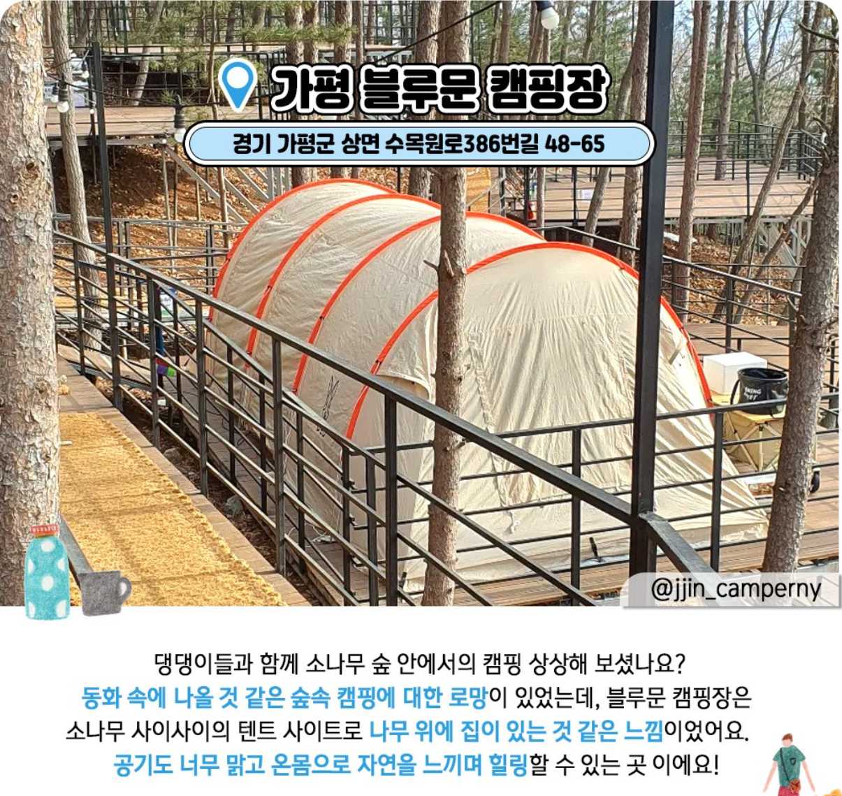 - 가평 블루문 캠핑장 / 경기 가평군 상면 수목원로386번길 48-65 : 반려견과 함께 캠핑할 수 있는 곳입니다. 소나무 사이사이 캠핑장이 있어 나무 위에 집이 있는 것 같은 느낌이 듭니다. 공기도 좋고, 뷰도 좋습니다.