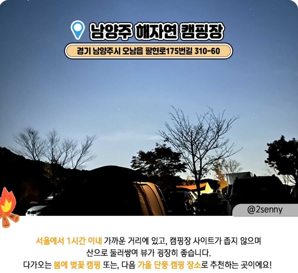 - 남양주 해자연 캠핑장 / 경기 남양주시 오남읍 팔현로175번길 310-60 : 서울에서 1시간 이내에 있는 캠핑장으로 거리가 가깝고, 캠핑장 사이트가 좁지 않은 것이 장점입니다. 산으로 둘러싸여 뷰가 좋고, 봄-벚꽃, 가을-단풍 캠핑지로 좋습니다.