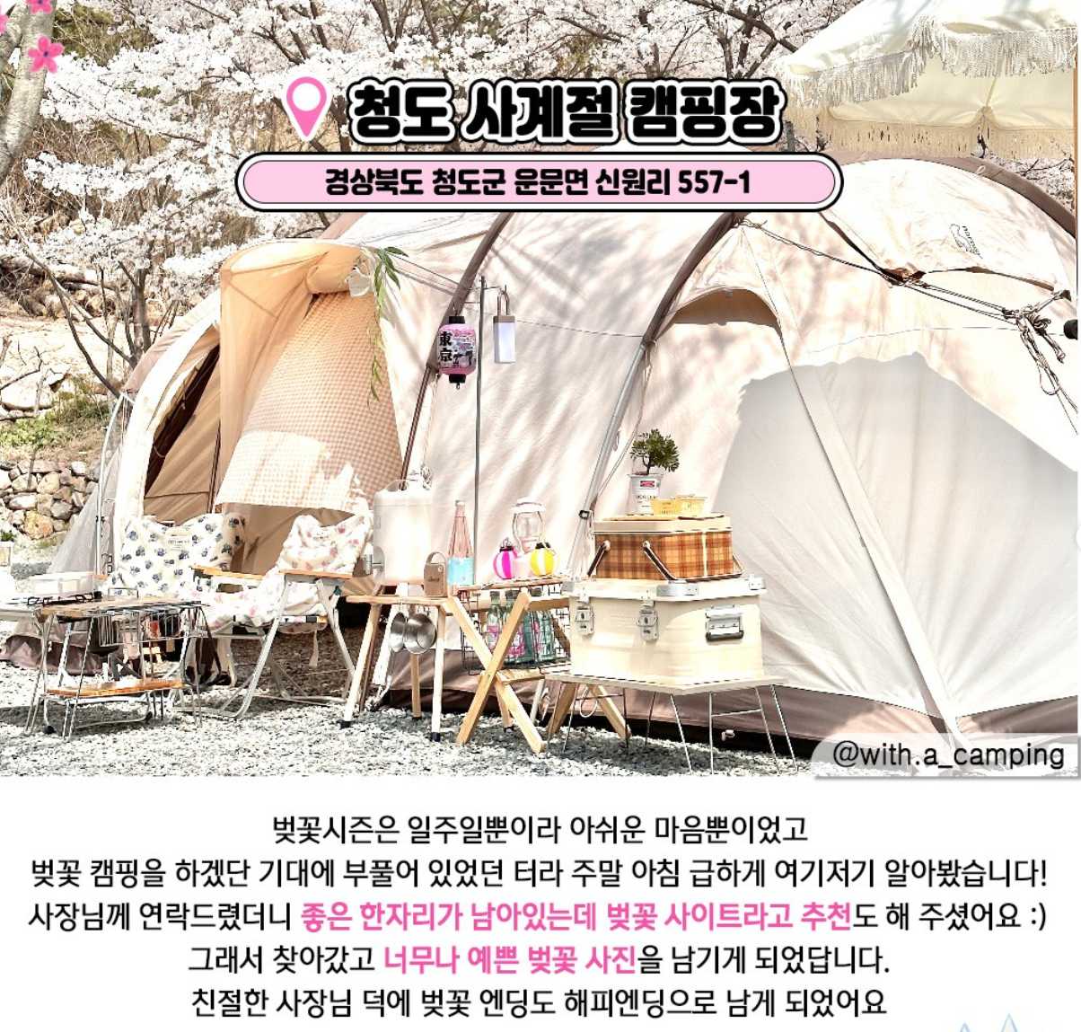 - 청도 사계절 캠핑장 / 경상북도 청도군 운문면 신원리 557-1 : 벚꽃시즌에 좋은 캠핑장