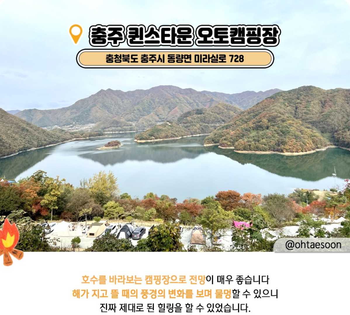 - 충주 퀸스타운 오토캠핑장 / 충청북도 충주시 동량면 미라실로 728 : 호수 전망이 좋은 캠핑장입니다. 해가 지고 뜰 때 풍경이 아름답고 물멍 하기 좋습니다.