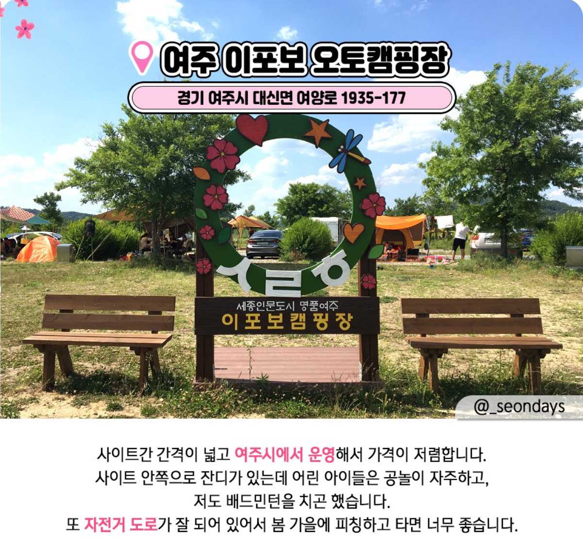 - 여주 이포보 오토캠핑장 / 경기 여주시 대신면 여양로 1935-177 : 여주시에서 운영하는 곳으로 가격이 저렴합니다. 사이트 안쪽에 잔디가 있어 어린이들 공놀이하고, 어른들 배드민턴 치기 좋습니다. 자전거 도로가 잘 되어 있어 자전거 타고 캠핑하기 좋은 곳입니다.